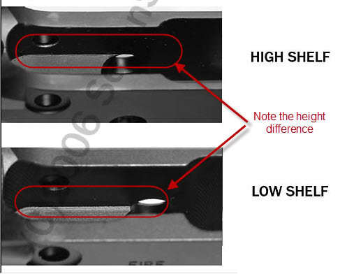 - Solution 2: Verify your lower is not a “high shelf” lower (see Picture 1 below). In rare cases, there are some “low shelf” lowers that are made just slightly out of spec and need just a little material removed from behind the safety hole to allow the cam to rotate fully, you can Dremel this out or have a gunsmith/machinist mill it out slightly.